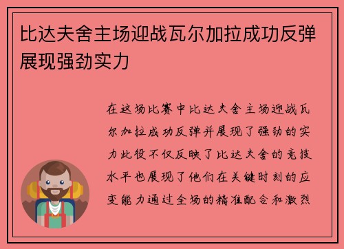 在这场比赛中,比达夫舍主场迎战瓦尔加拉成...