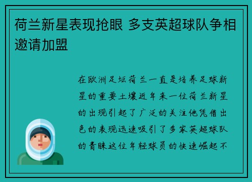在欧洲足坛,荷兰一直是培养足球新星的重要...